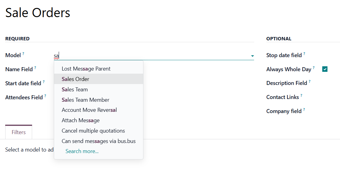 For example, if you choose the 'Sales Order' model, events will be created based on the existing Odoo quotations.