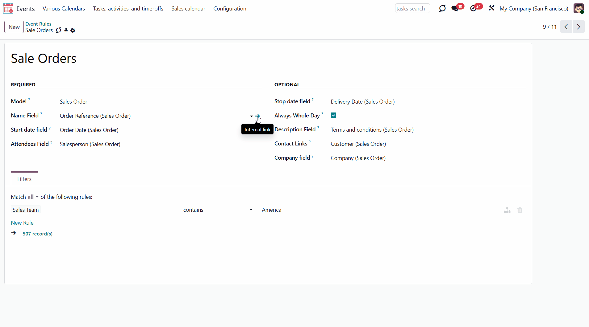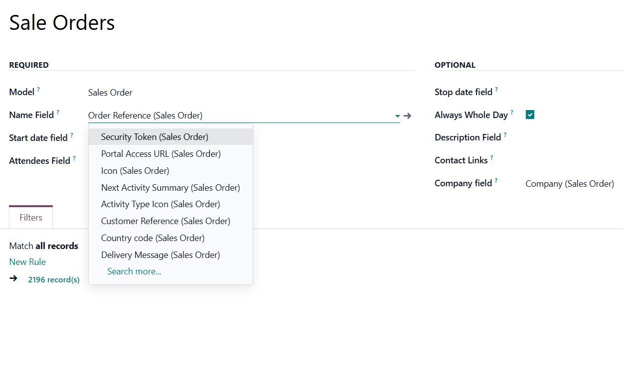 For example, if you create a rule for the model 'Sale Order' and choose the ‘Order reference’ for the Name Field, then an event related to the quotation ‘S00001’ will also be named ‘S00001’.