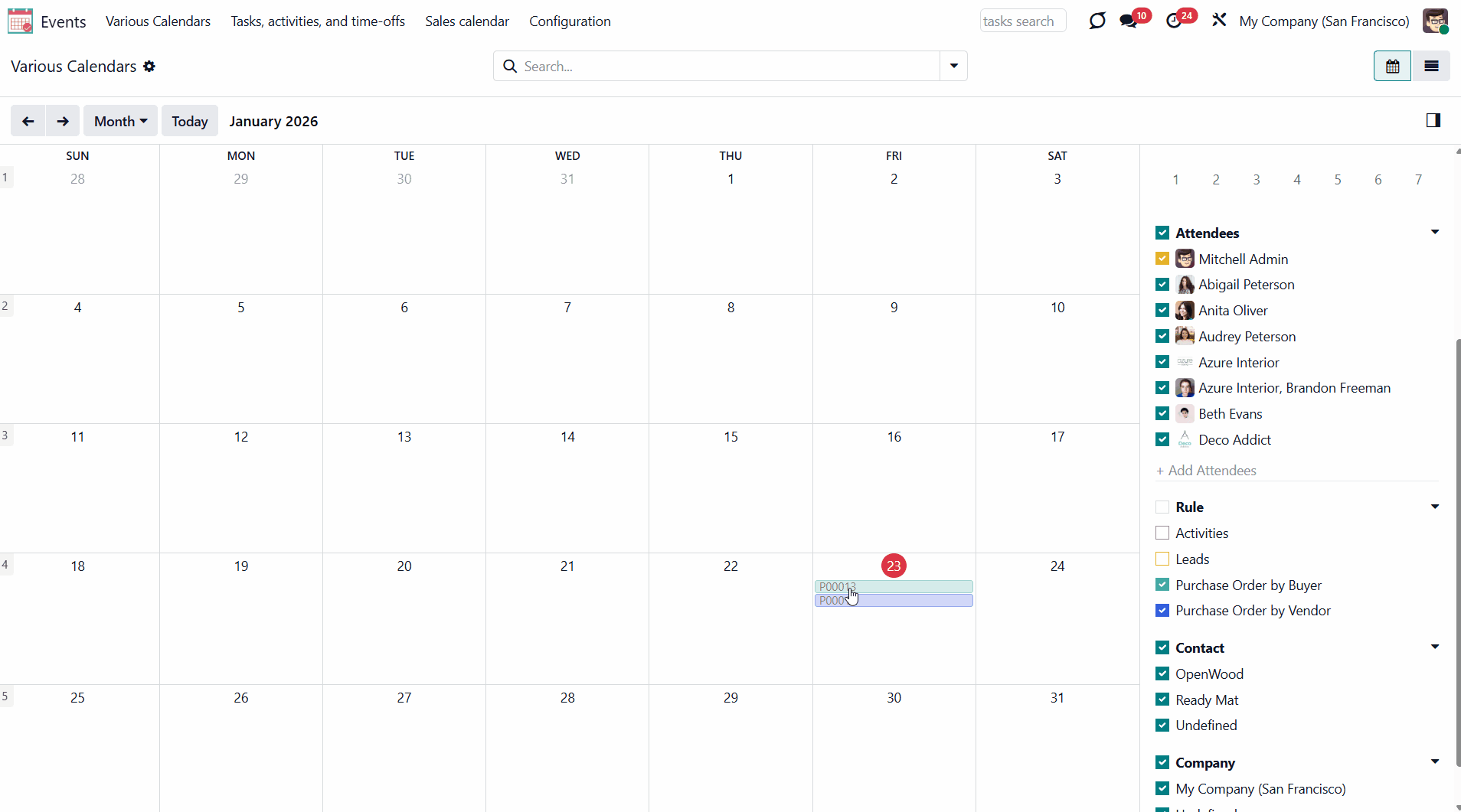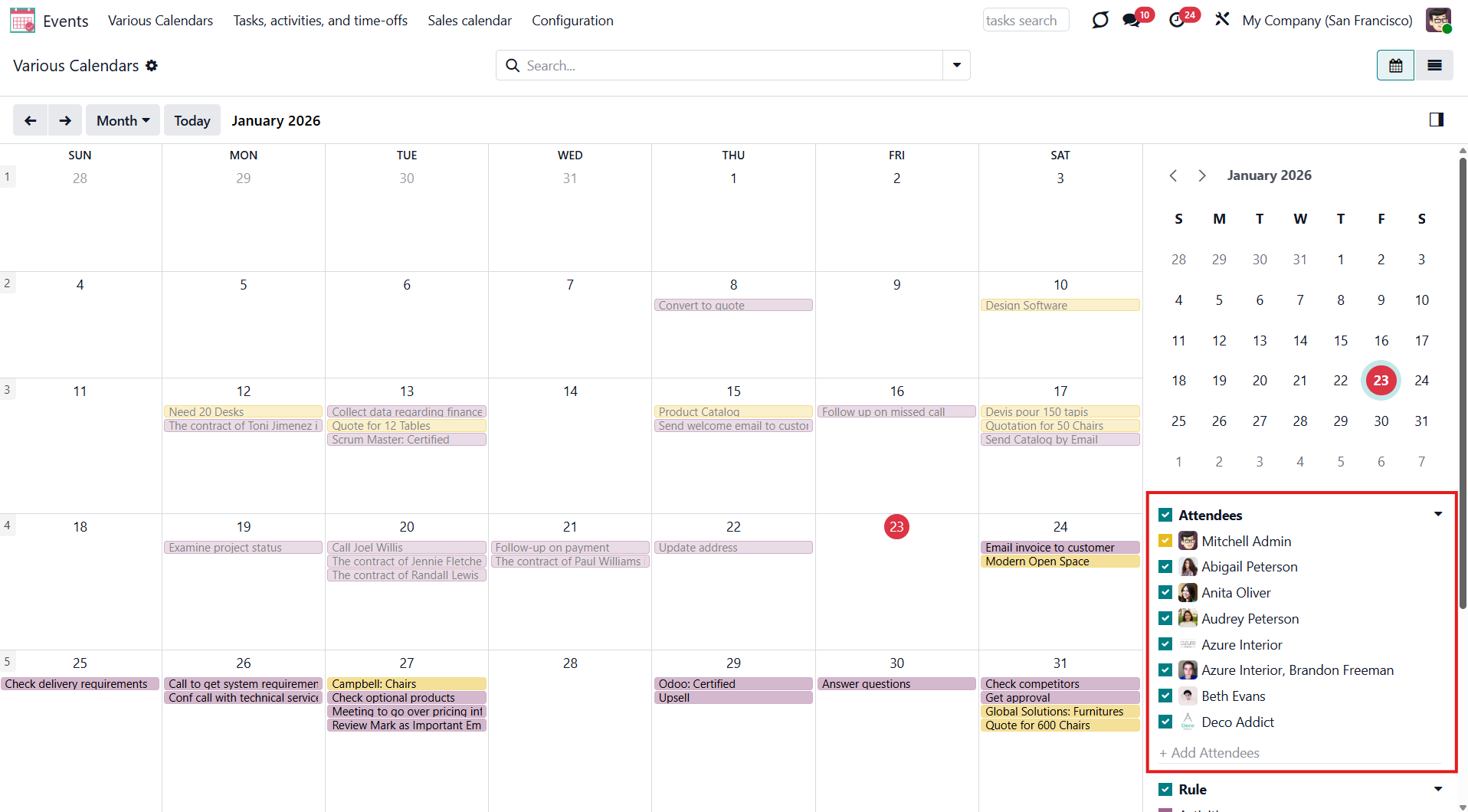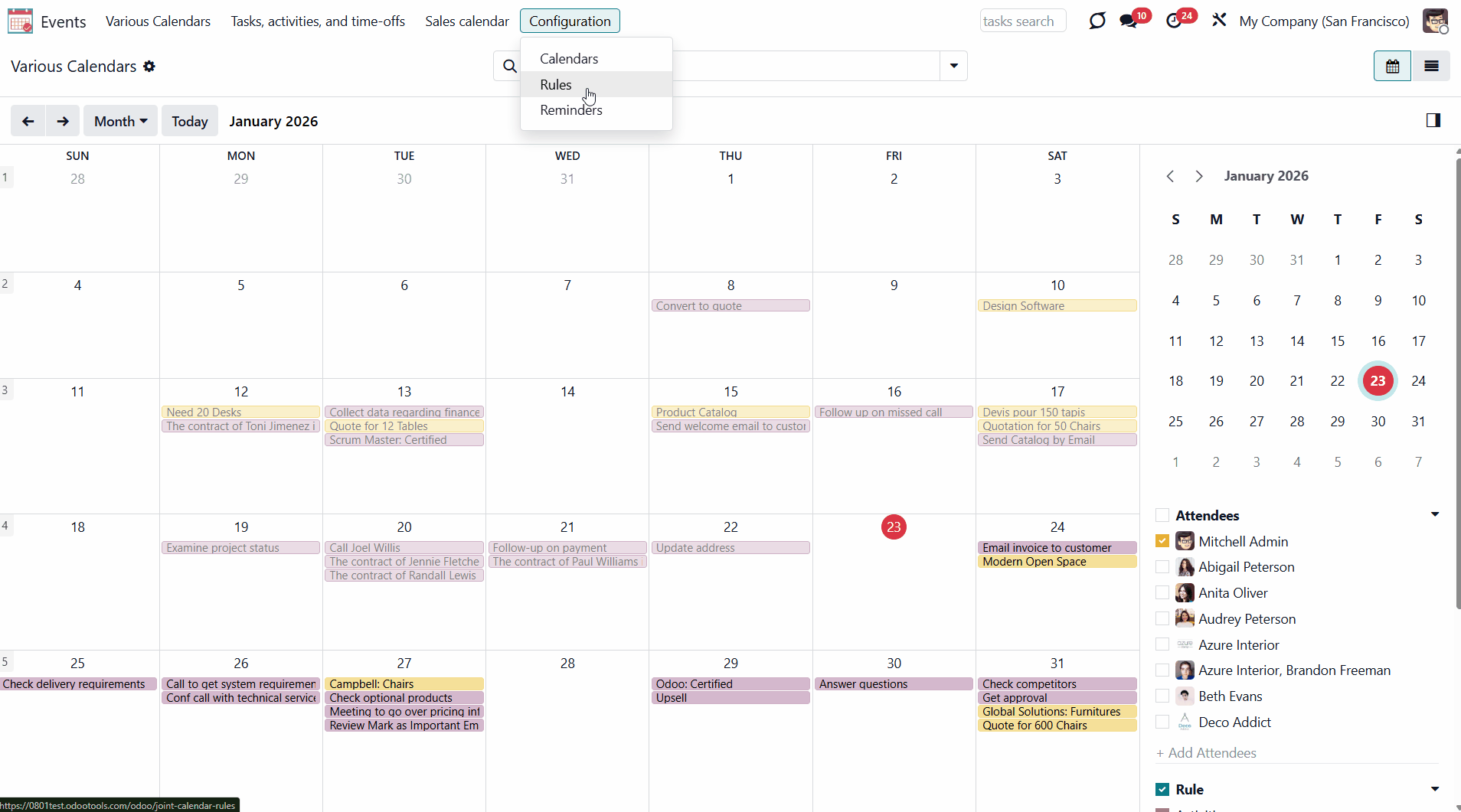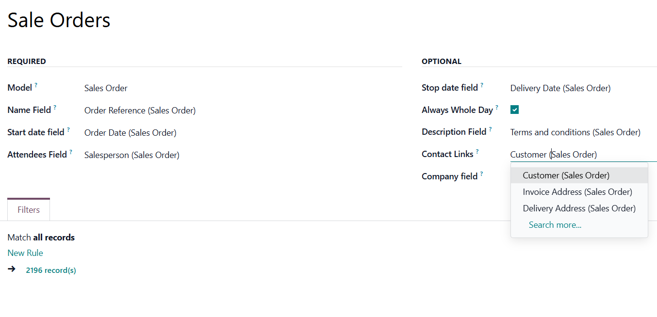For example, if you create a rule for the model 'Sale Order' and choose 'Salesperson' for the Attendees field, then joint event participants would include a quotation salesperson. Also, the event will appear when you sort events by this salesperson in the attendees section of the 'Events' menu (see Joint Calendar Interface).