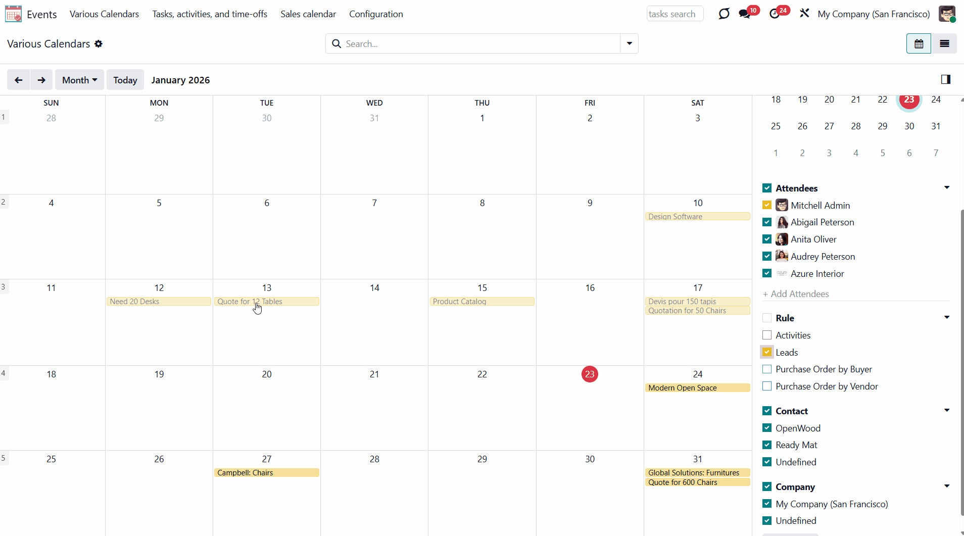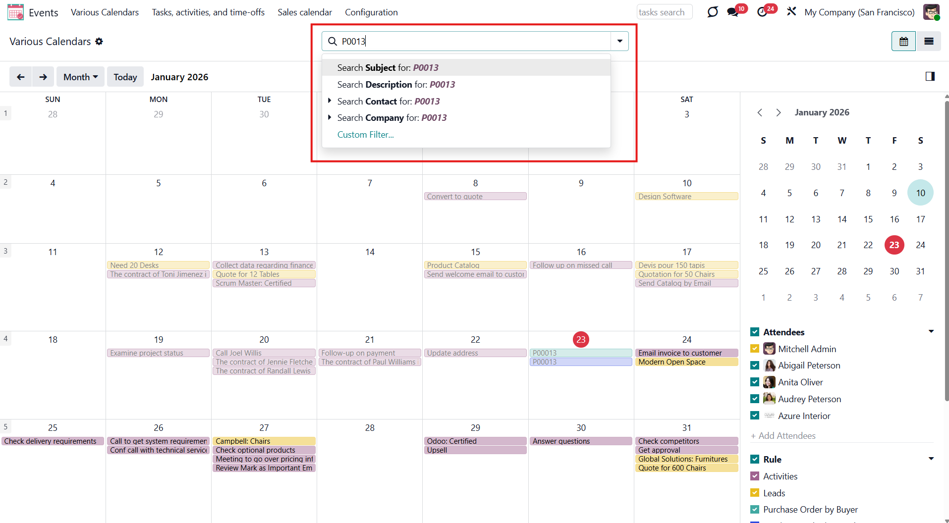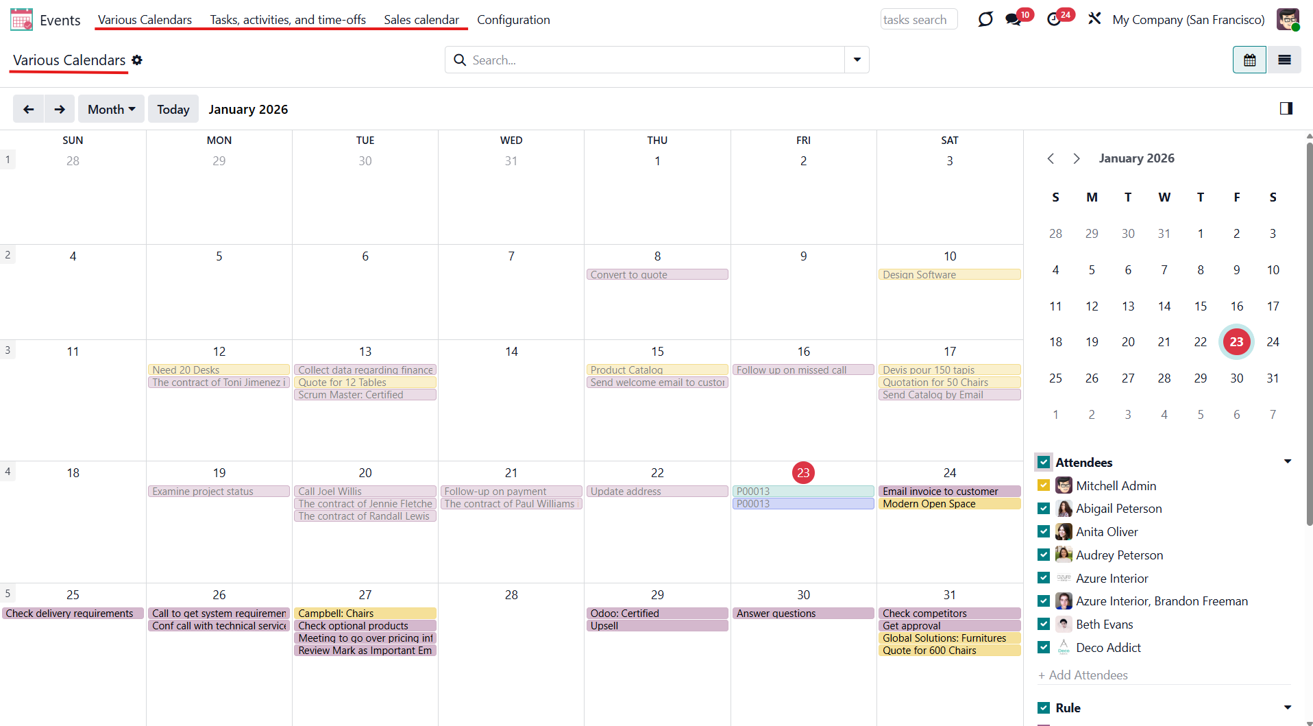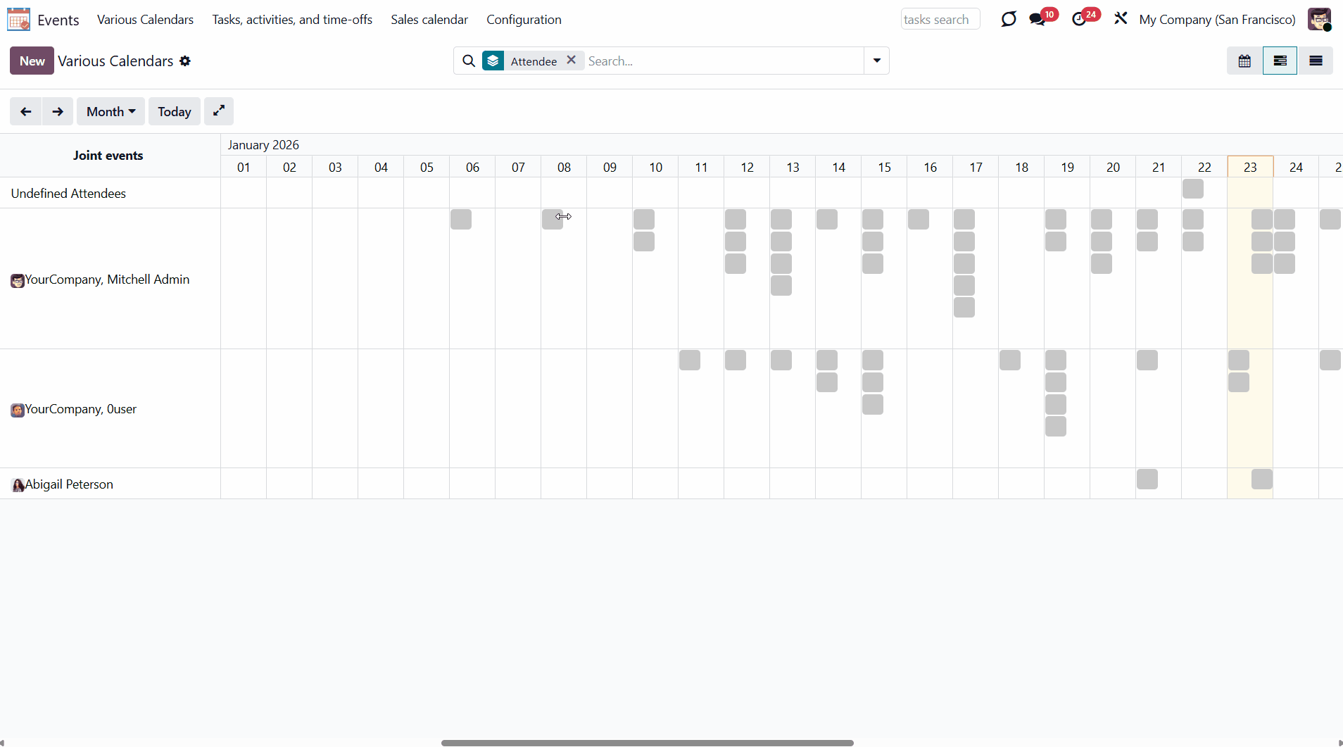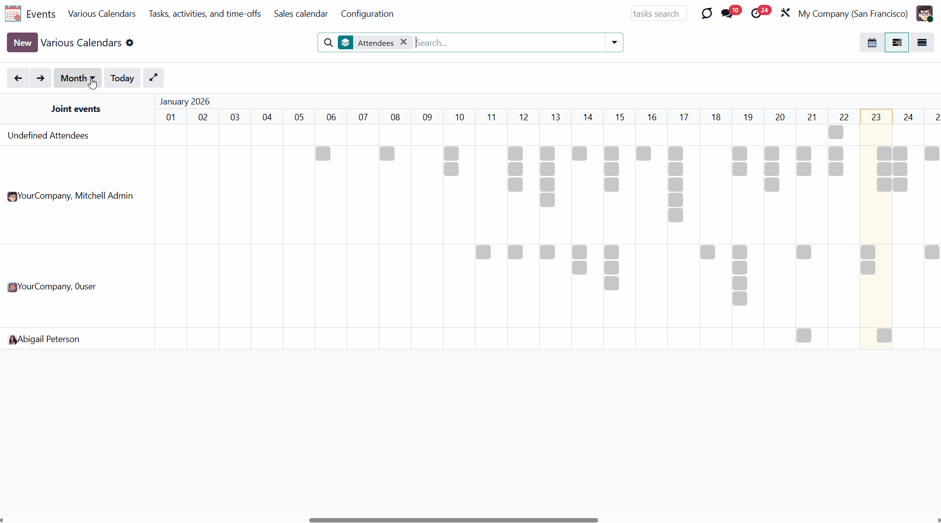 For example, if you create a rule for the model 'Sale Order' and choose 'Salesperson' for the Attendees field, then joint event participants would include a quotation salesperson. Also, the event will appear when you sort events by this salesperson in the attendees section of the 'Events' menu (see Joint Calendar Interface).