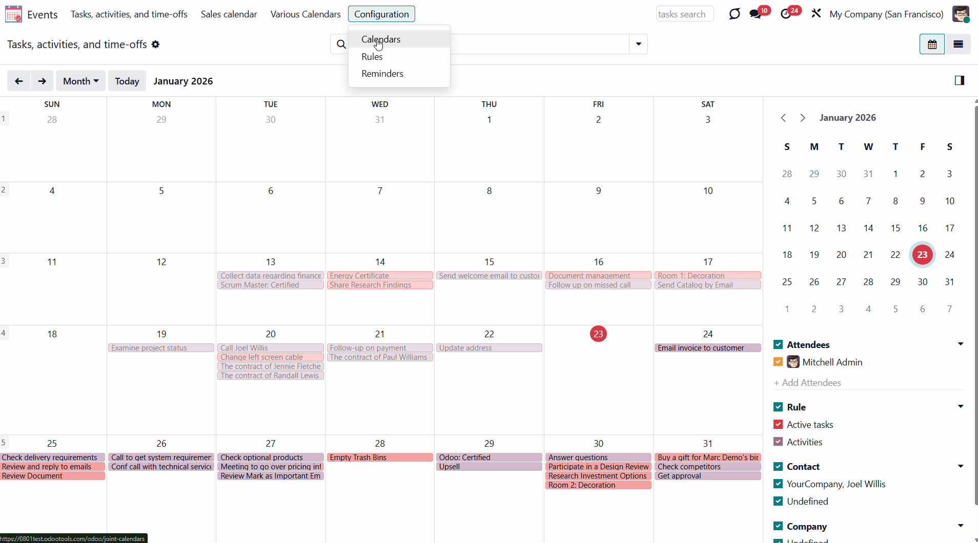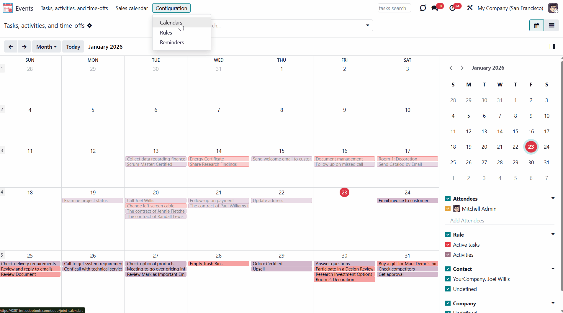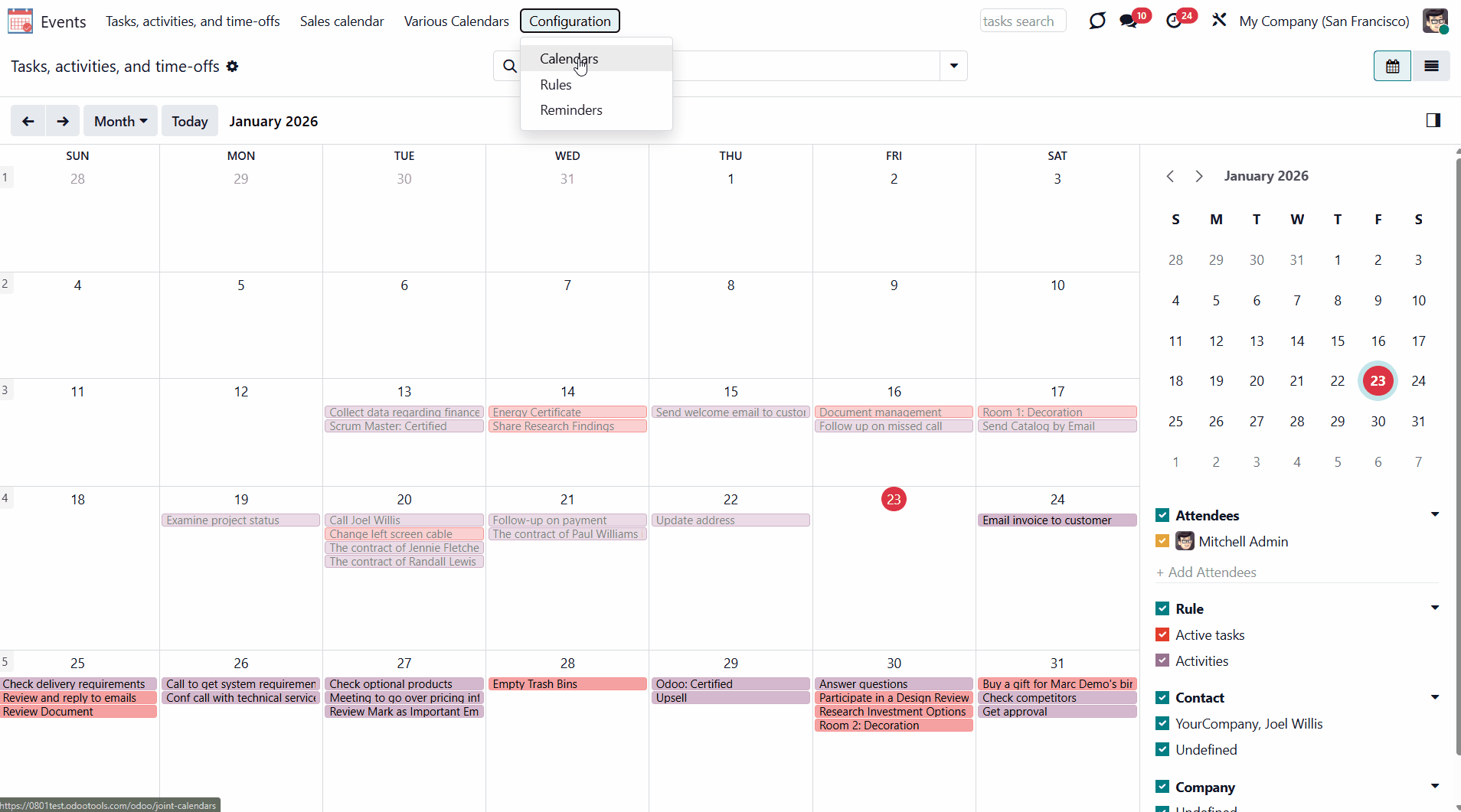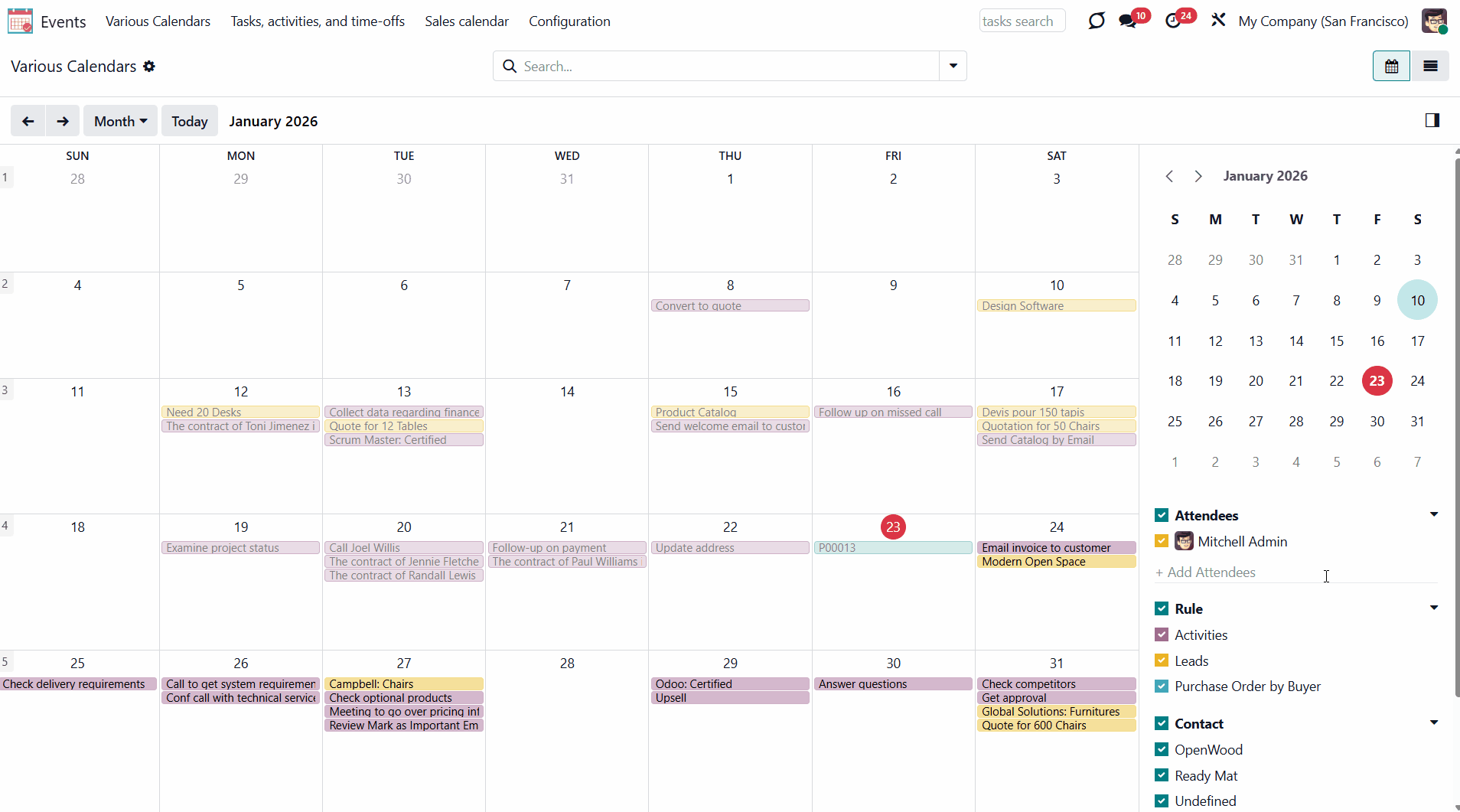 For example, if you create a rule for the model 'Sale Order' and choose 'Salesperson' for the Attendees field, then joint event participants would include a quotation salesperson. Also, the event will appear when you sort events by this salesperson in the attendees section of the 'Events' menu (see Joint Calendar Interface).