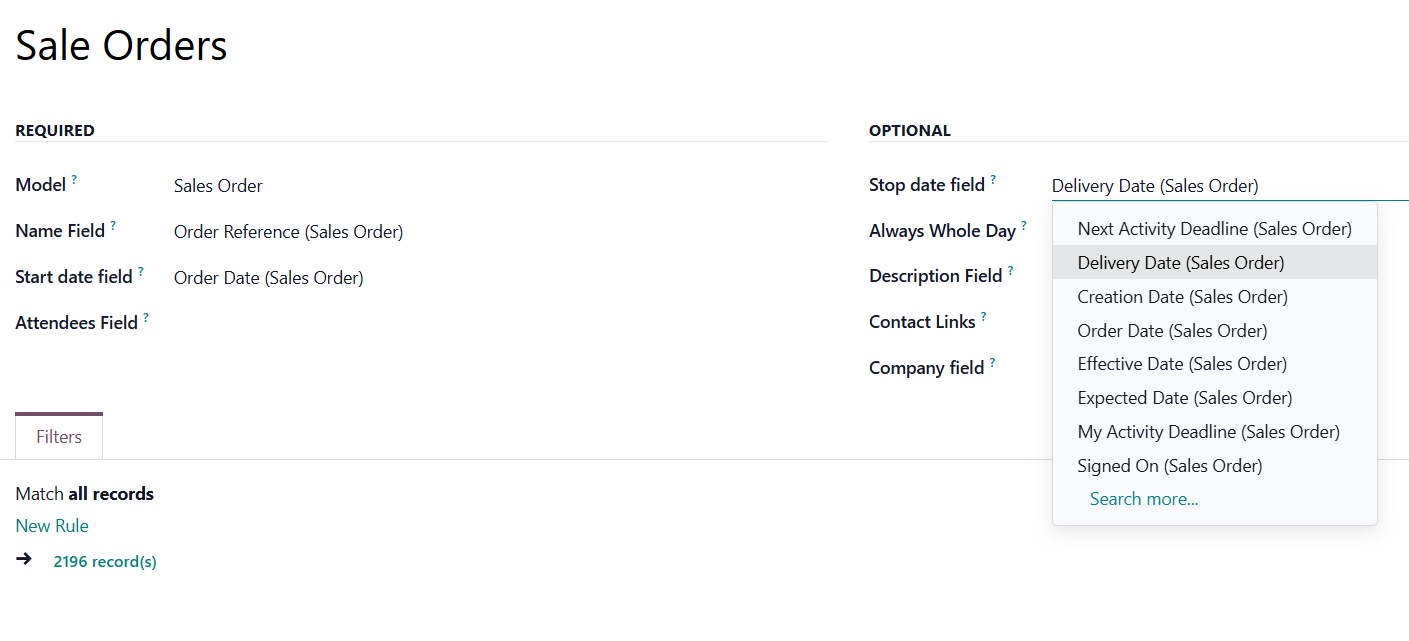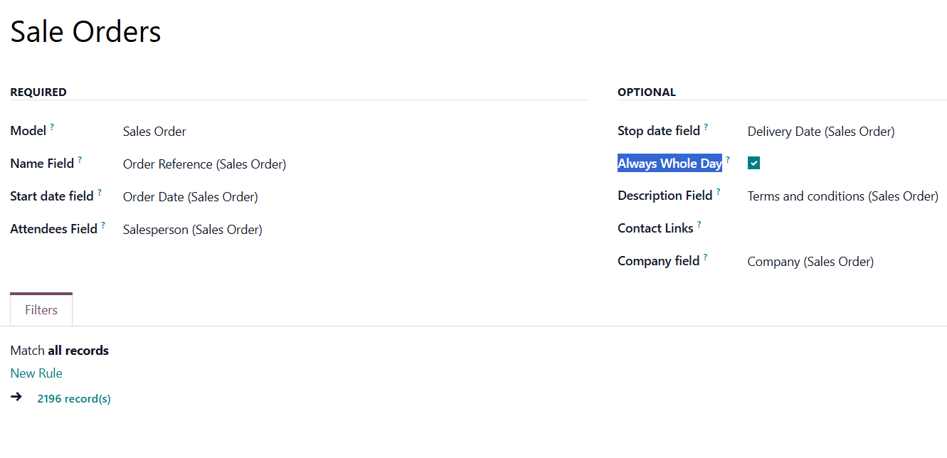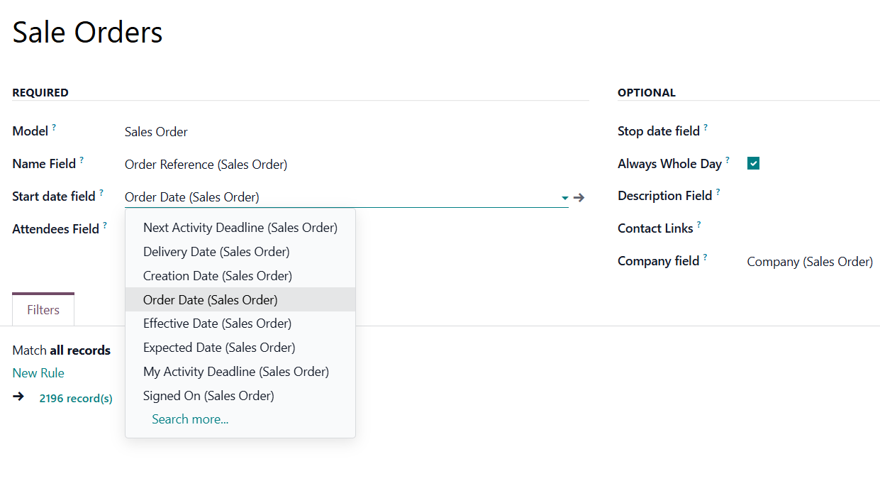 For example, if you create a rule for the model 'Sale Order' and choose the 'Order Date' for the Start date field, then the event will appear in the calendar on the same day for which the quotation is planned.