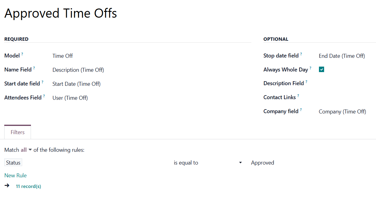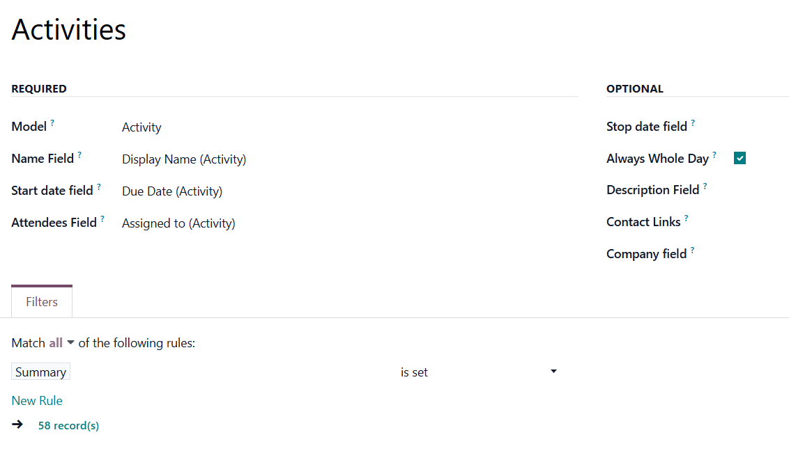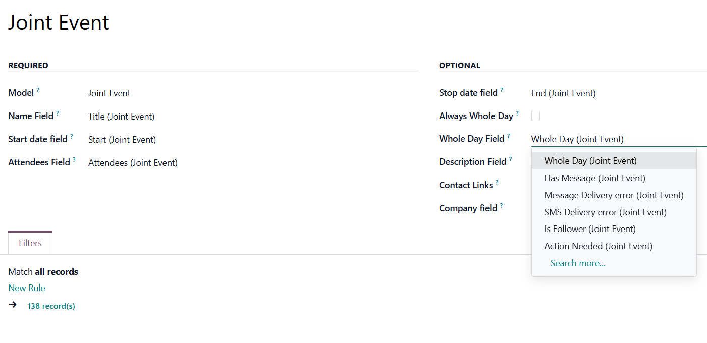 Whole Day - a special Boolean field of the source object indicates that a related joint event may last the entire day. This setting is usually applied to standard Odoo calendar events, which may have a specific time or be scheduled for an entire day. This optional field is available only if the 'Always Whole Day' setting is turned off.