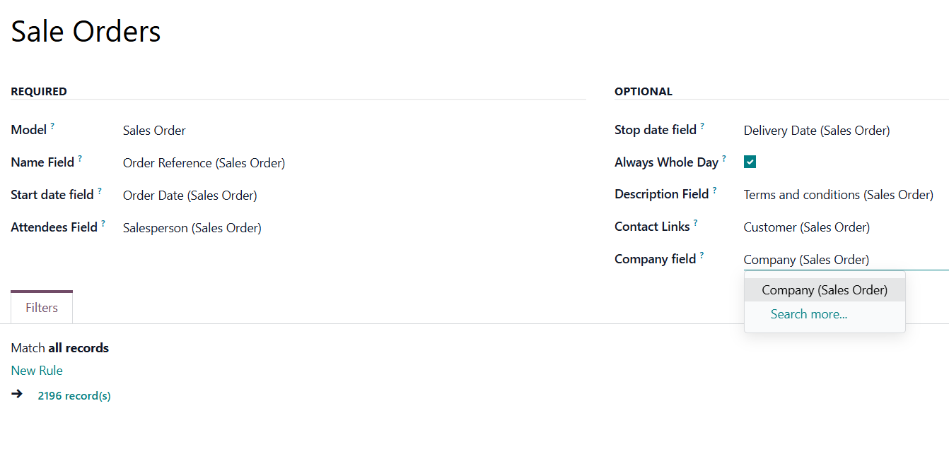 For example, if we create a rule for the model 'Sale Order' and choose 'Company' as the Company field, then, in case we assign a calendar to a particular company, the module will be able to distinguish to which company the object relates, and, therefore, will show only the related ones.
