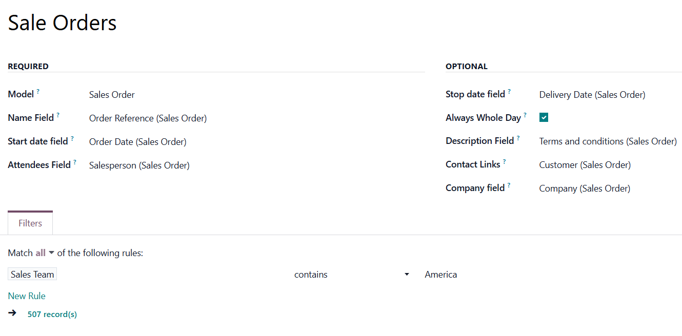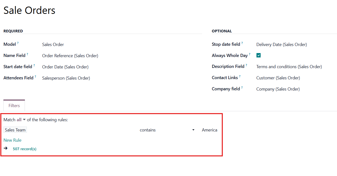 If you add a filter 'Sales Team contains America', only the matching records will be used to create events; in this case, only the Sales Orders of the sales team America.