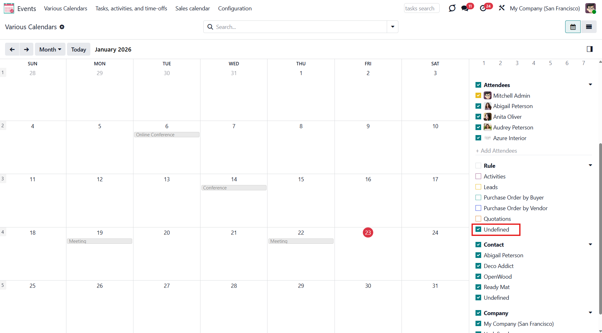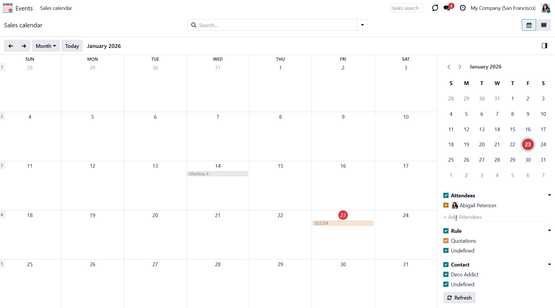 Let's see an example. We have a 'Sales Calendar', which can be accessed by sales administrators and salespeople. If Abigail Peterson, our salesperson, enters the 'Events' menu, she will see this calendar. By default, she sees only her events. In January, she created the event - 'Meeting 4'. If she clicks another attendee, e.g., Mitchell Admin, on the right side of the interface, then she will see all Mitchel's events to which she has access. However, those events do not involve Abigail herself.