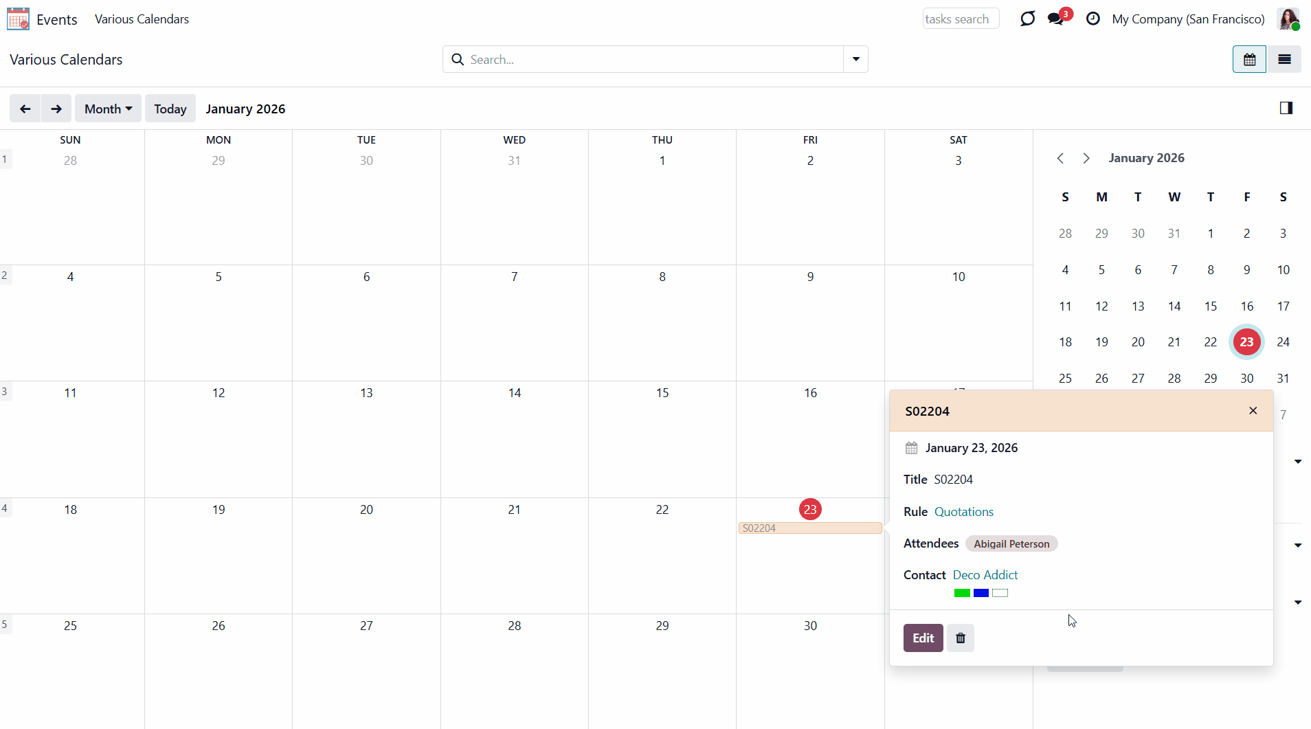 The related Odoo modules regulate object permissions. For example, Abigail Peterson sees the order 'S02204', but doesn't have access to Mitchel's order 'S02203', so she will not see it in the calendar either.