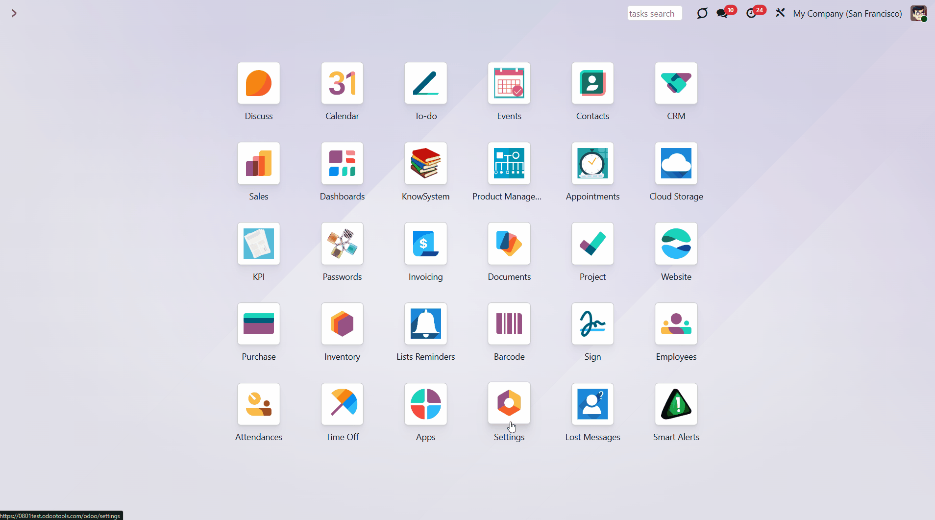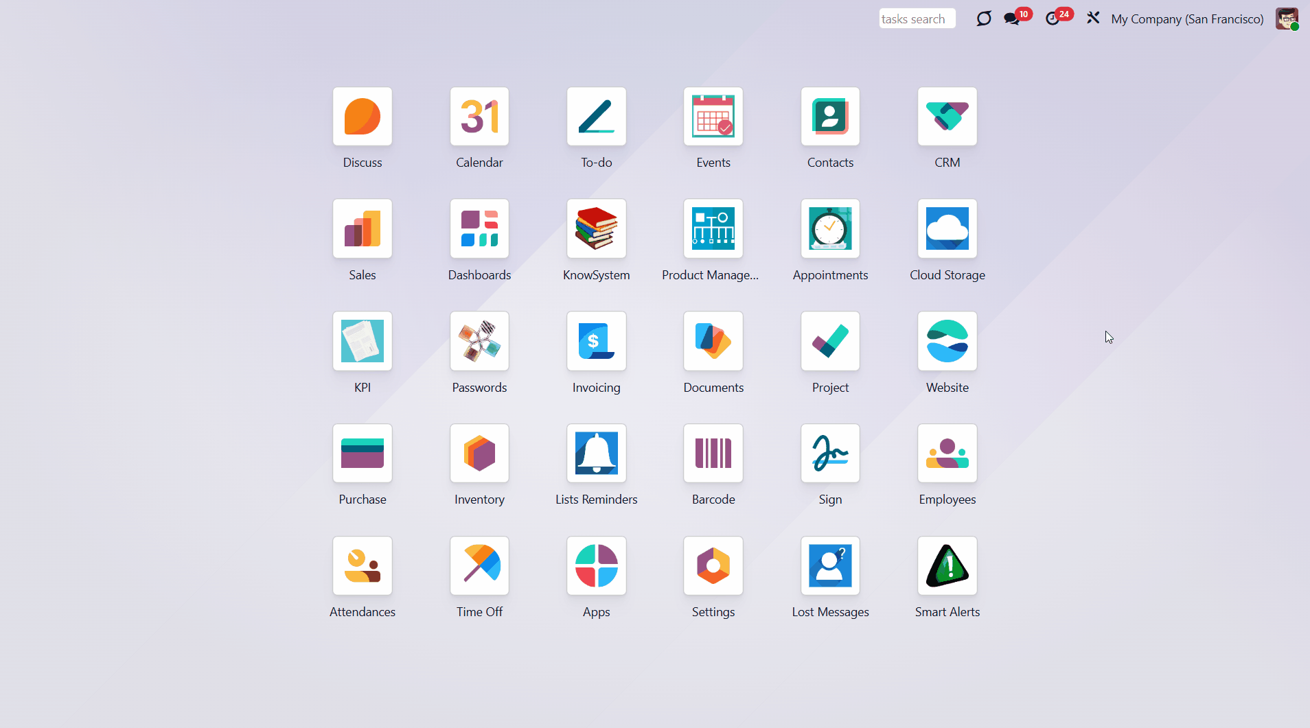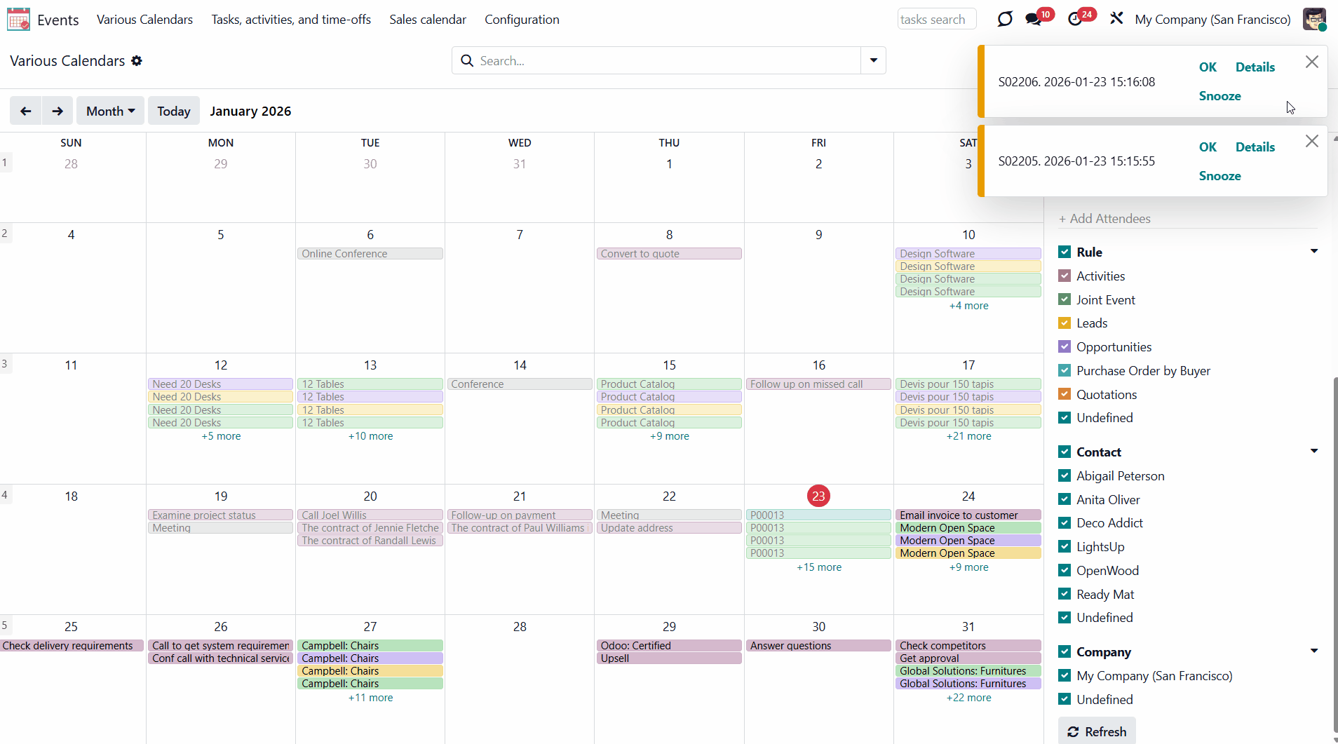 Calendar configuration lets you assign pop-ups and email alarms. Thus, you can be notified of any Odoo event or activity.