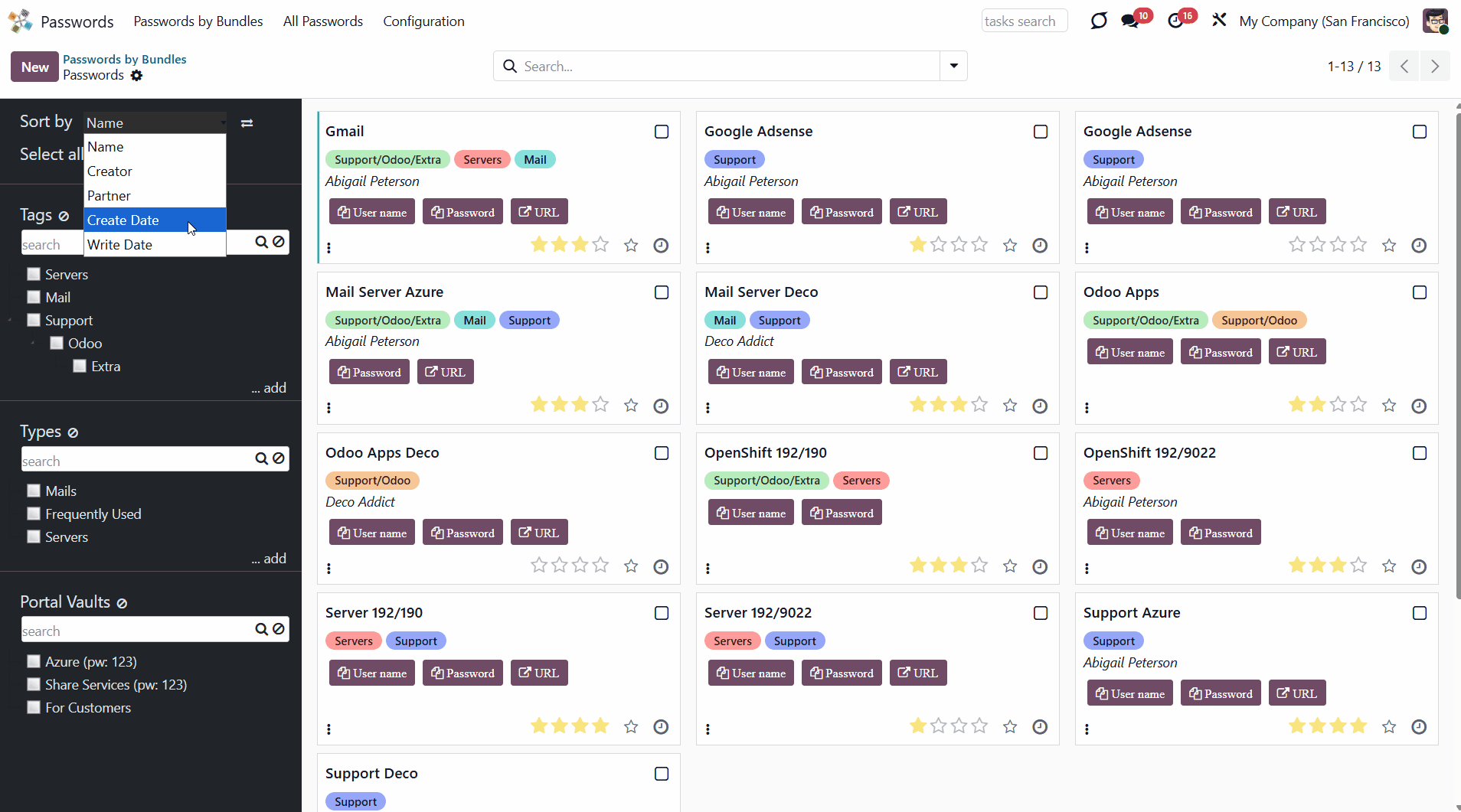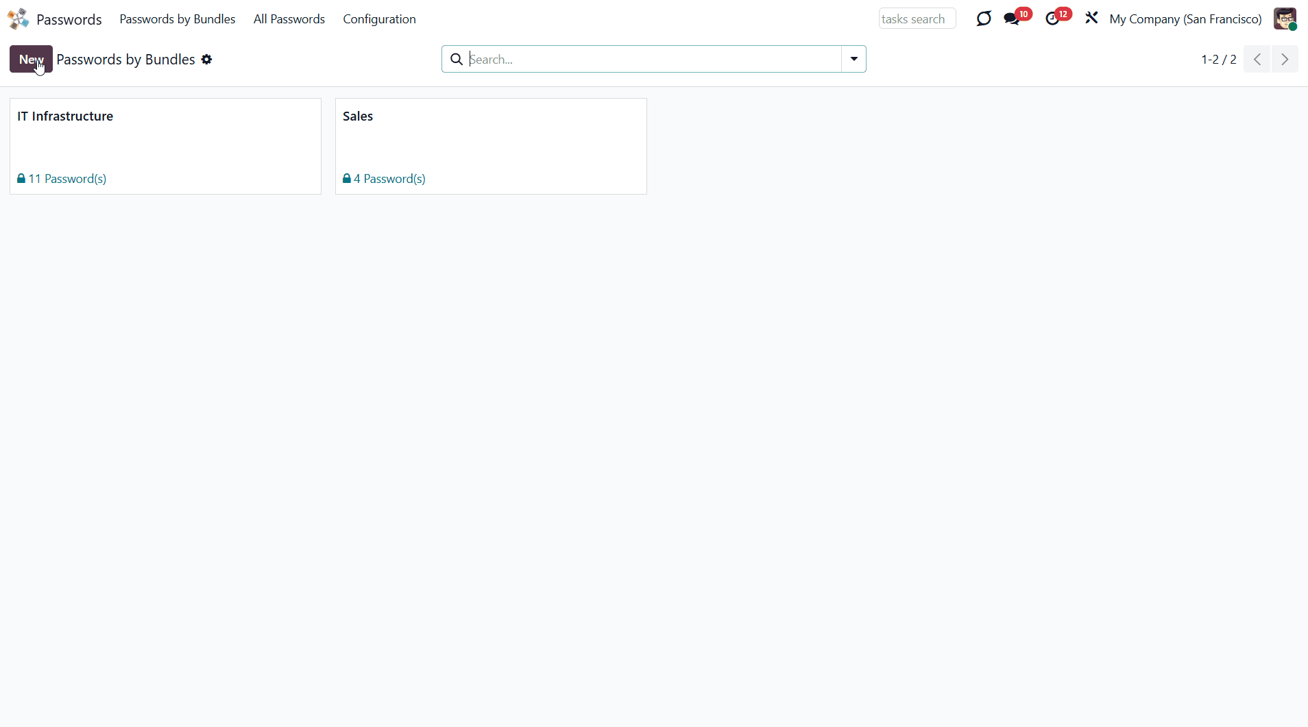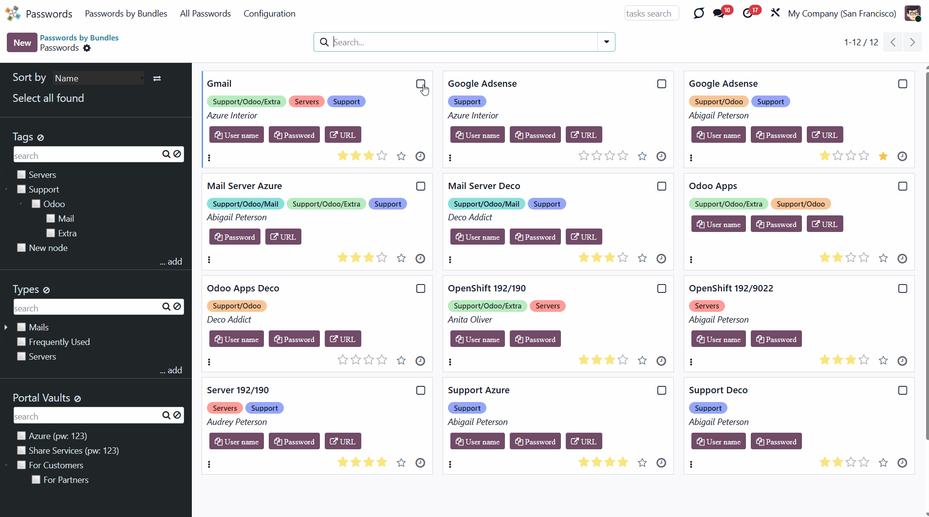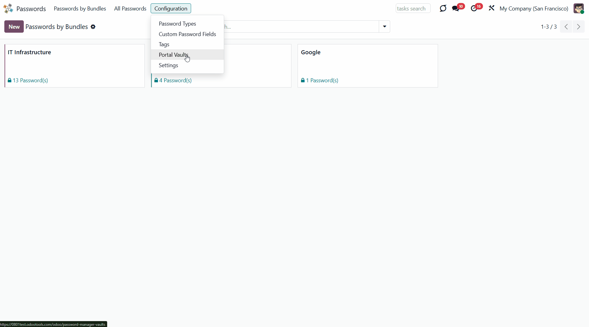 Within a password bundle, you can create an unlimited number of portal password vaults, each of which can be shared with an unlimited number of Odoo partners. There are several ways of creating a portal vault: