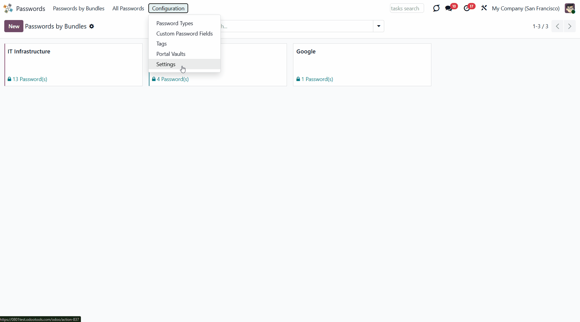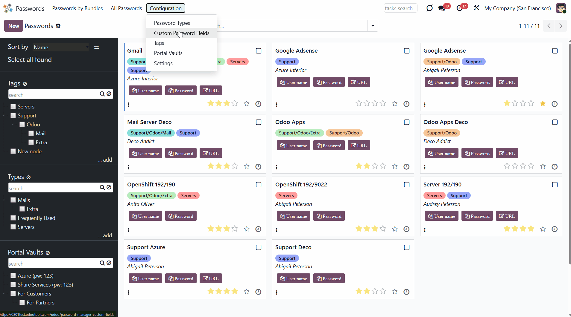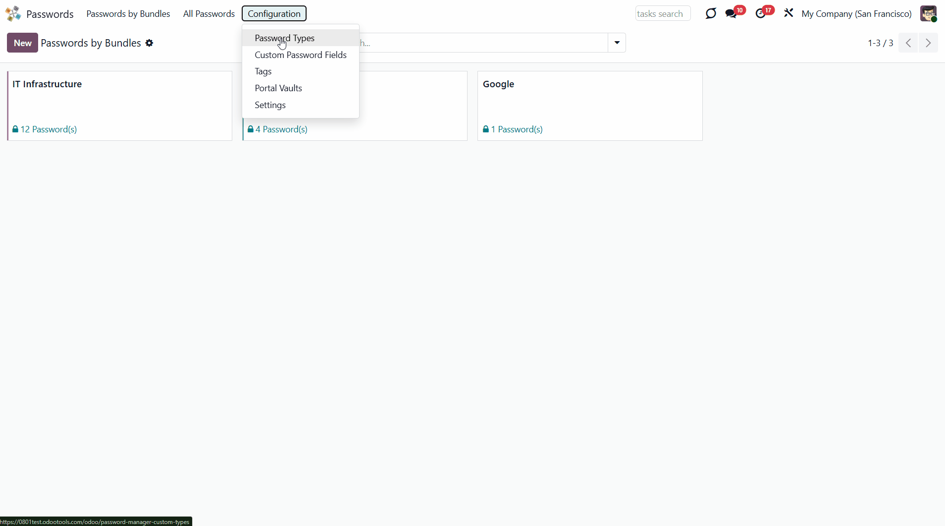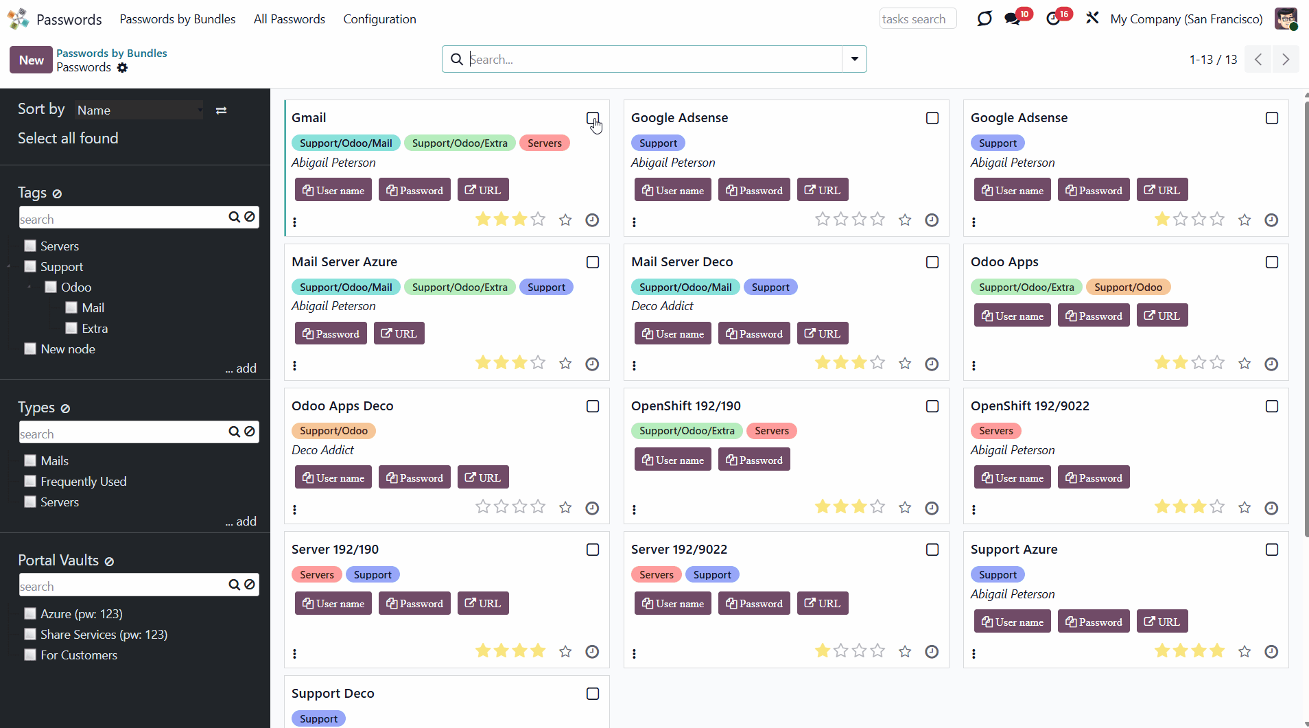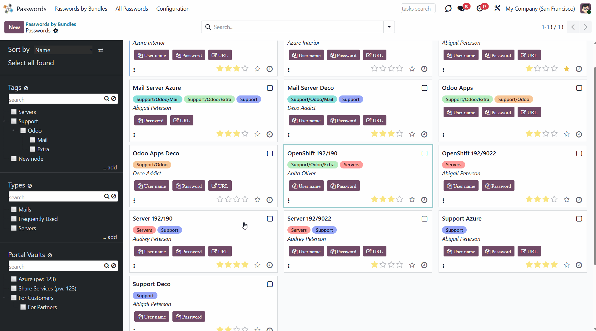 Within a password bundle, you can create an unlimited number of portal password vaults, each of which can be shared with an unlimited number of Odoo partners. There are several ways of creating a portal vault: